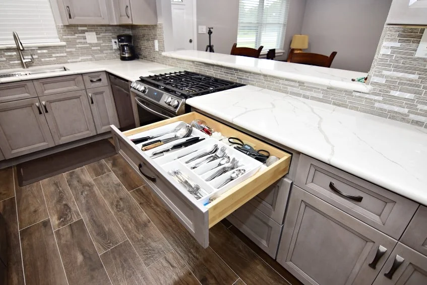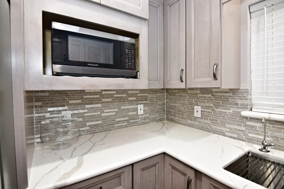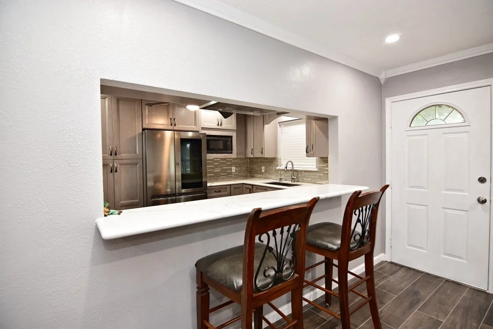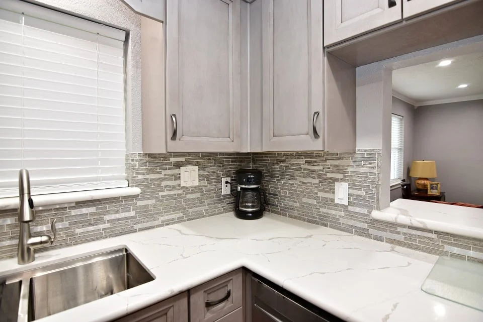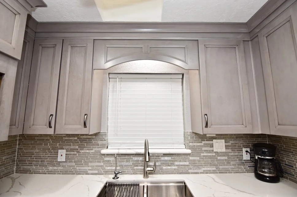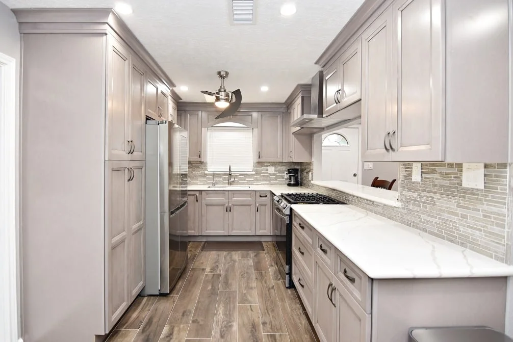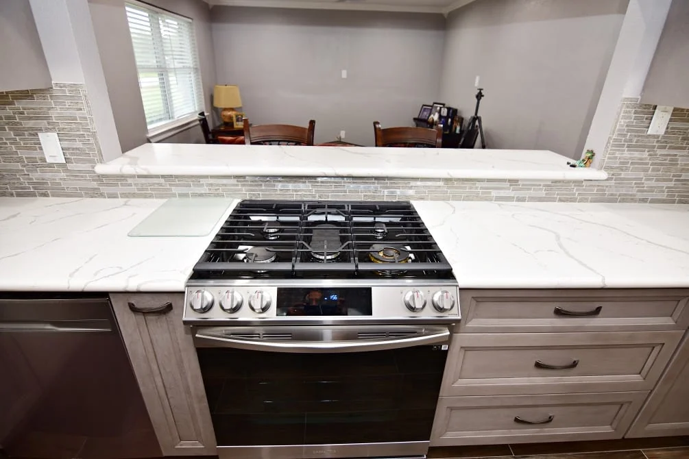 Designer: Tony Kaplan Showroom: USA Cabinet Store-Houston Cabinet Line: Fabuwood Door Style: Onyx Color: Horizon Countertop: Earthstone Calacatta Petrella Hardware: Hardware Resources Backsplash : The Tile Shop Project Cost: $24,000
