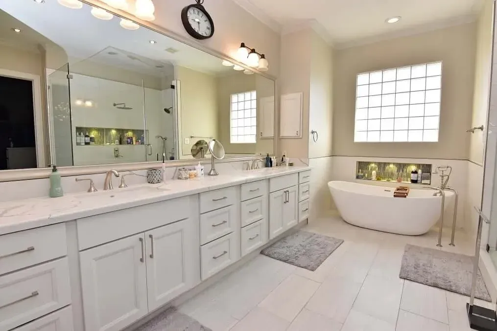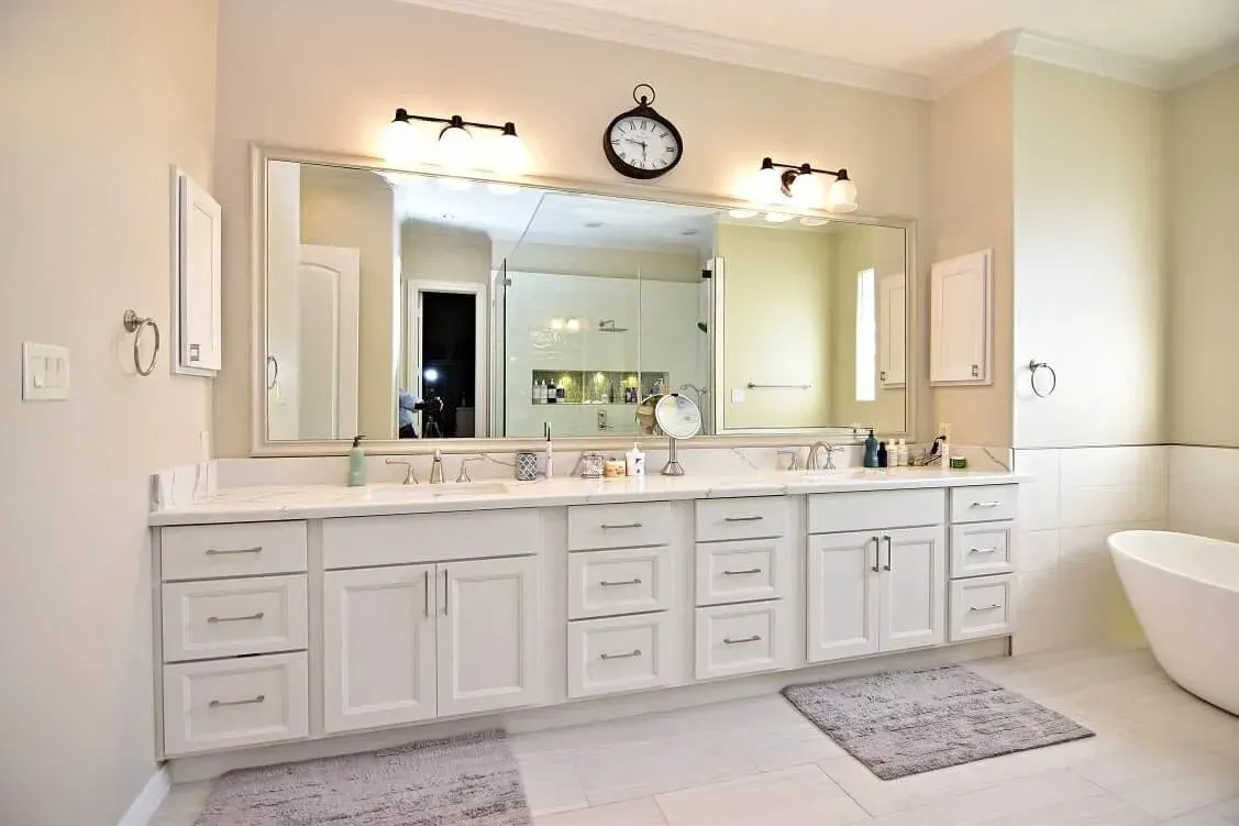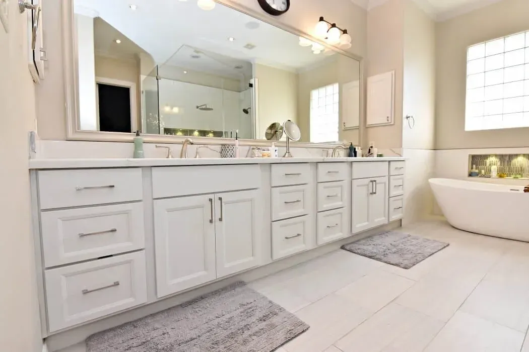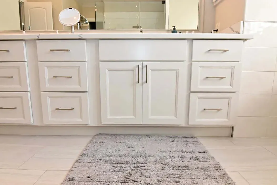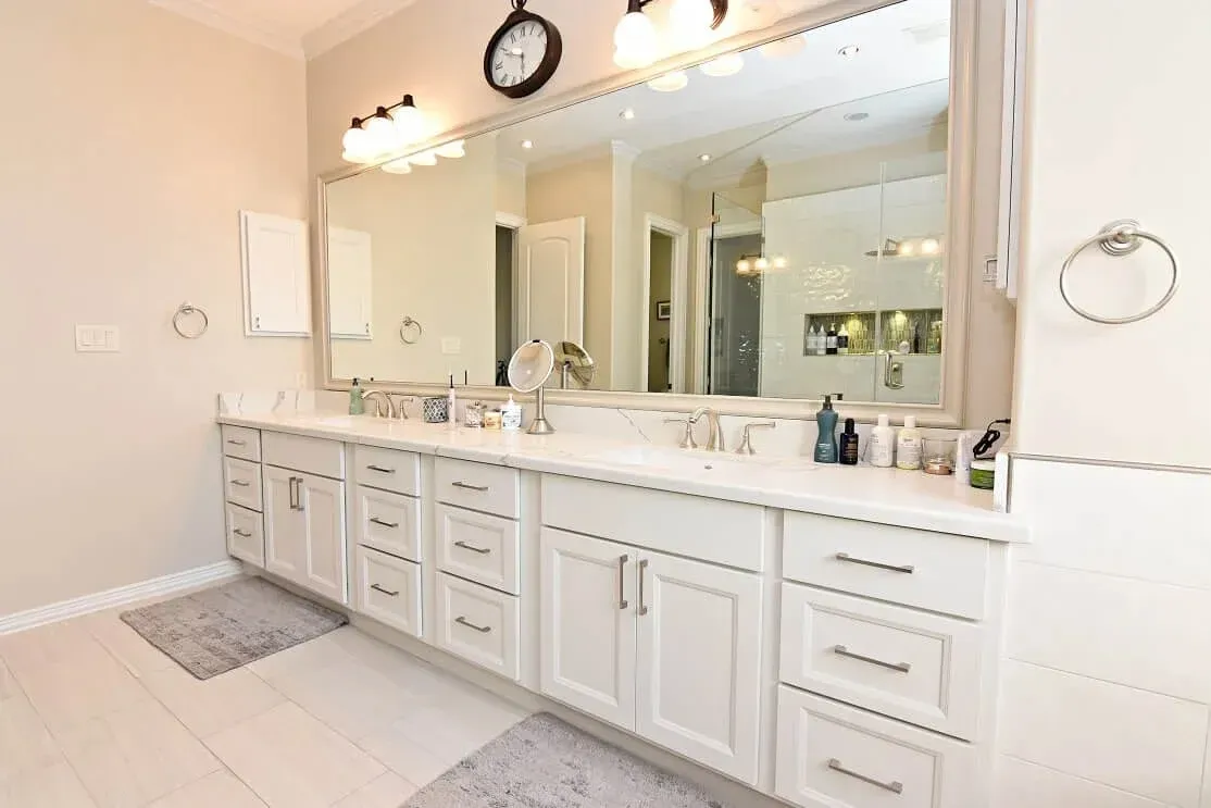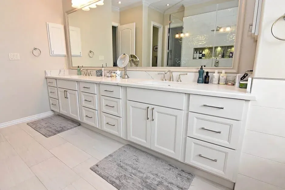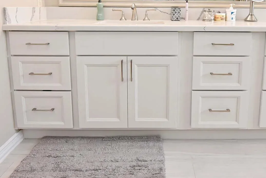 Designer: Tony Kaplan Showroom: USA Cabinet Store-Houston Cabinet Line: Showplace Overlay Door Style: Edgewater Color: Heron Plume Countertop: Citiquartz Kentucky Hardware: Hardware Resources Backsplash : Project Cost: $29,000